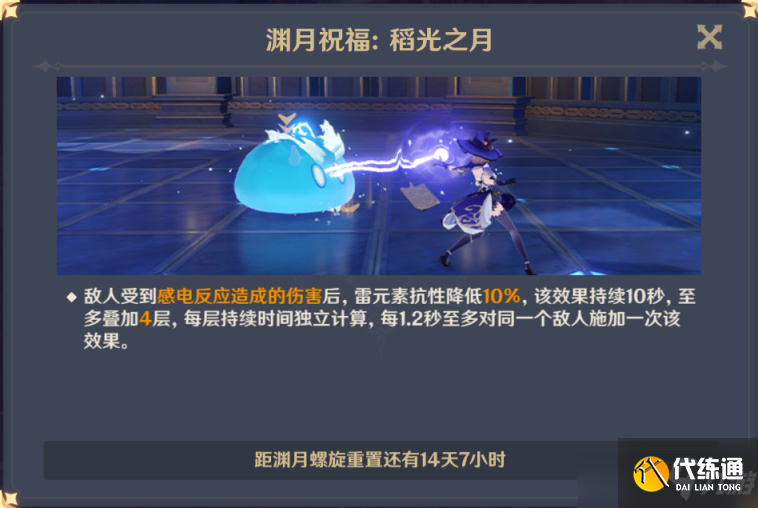 本期祝福为敌人受到感电反应造成的伤害后,雷元素抗性降低10%,该效果持续10秒,至多叠加4层,每层持续时间独立计算,每1.2秒至多对同一个敌人施加一次该效果。