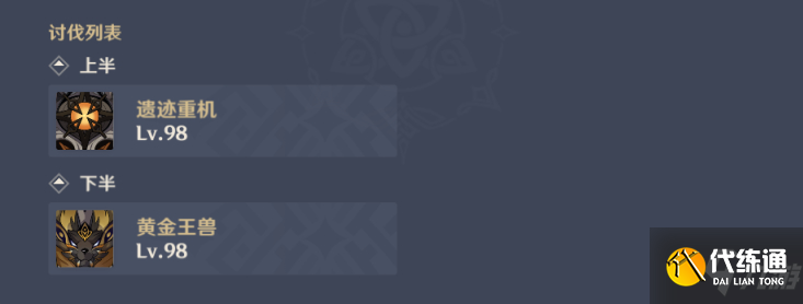 黄金王兽生命被削弱到一定程度后会生成一个无敌盾,并产生三个岩狗头,需要岩元素来加快打爆狗头(其他元素可以但是非常的慢),因此最好带一个岩系角色。