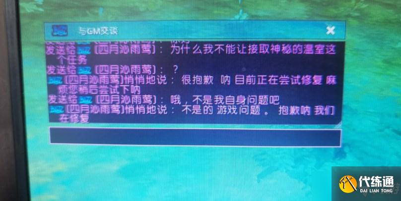 神秘的温室任务是玩家才刷新出来的,想要去做任务的时候,却发现不能接取任务了,玩家们也去问GM了,对方给出的回答表明这不是玩家们的问题,神秘的温室是游戏问题,正在修复。