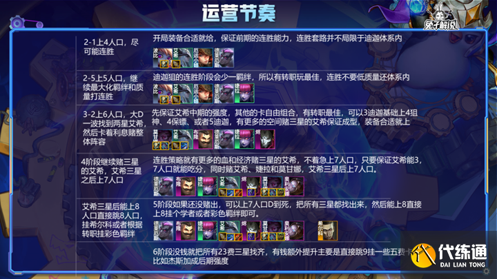 开局抢大剑、攻速、拳套等暴力装备,因为要连胜,所以要么就是开局装备好,要么有转职额外战力再玩,不用强行玩,2-1上4人口,2-5上5人口,连胜不用局限于体系内,前期就是哪些强就上哪些,能纯连胜就纯连胜,不能的时间也不能1胜1负,要胜胜胜负负这样,保证经济的良好和较高的血量,不论前排还是后排的装备,没潘朵拉不等完美神装,而是有就上,保证最大化的战力,艾希的6件装备,有哪个就直接合哪个,有锻炉更佳。