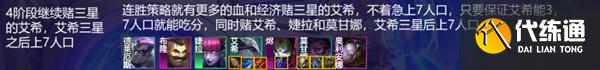 3-2上6人口,这里要大D一波,主要是凑齐2星的艾希,2星的保镖,保证整个3阶段能打赢大多数人甚至纯连胜,根据转职的话,有4狙、5迪迦或者4保镖是最好的,然后卡着50的利息慢慢的找三星的艾希,因为有足够高的血量容错,小伙伴们就有更多的空间停在6人口找三星艾希,23阶段都不如何掉血,就算4阶段天谴全卖血都是能够接受的。