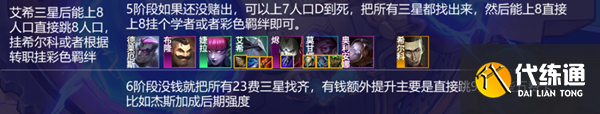最好满足暴力装备多,或者有转职的情况下连胜玩,整体思路在于保证艾希三星的成型,前期抢暴力装备,2-1上4人口,2-5上5人口,有额外转职前期战力拉满最佳,连胜不用局限于体系内,有装备只要是合适的直接给,而不用等完美神装保证连胜强度,3-2上6人口大D一波凑2星艾希和两星保镖,根据转职最大化当下质量,连胜或者稳血,有足够的空间能够一直卡着利息慢慢D三星的艾希,三星艾希之后上7人口挂满羁绊,天谴时甚至能够7人口D到死,7人口三星艾希加上一定血量基本上就能吃分了,三星的快上8人口根据转职挂彩色或者希尔科,很胡的时间上9人口提升5费2星吃鸡上限。