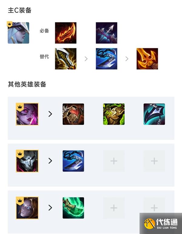 寒冰主C,羊刀轻语无尽,几乎没方法替换,不少人喜欢给巨杀打前排也很痛,但其实玩艾希就是靠技能的大范围去击杀后排,尤其在更新之后技能范围再加一格,艾希在面对一两个前排的阵容完全能够直接把后排切死,之后再围殴前排就好了,所以巨杀的优先级绝对是不如无尽轻语的。