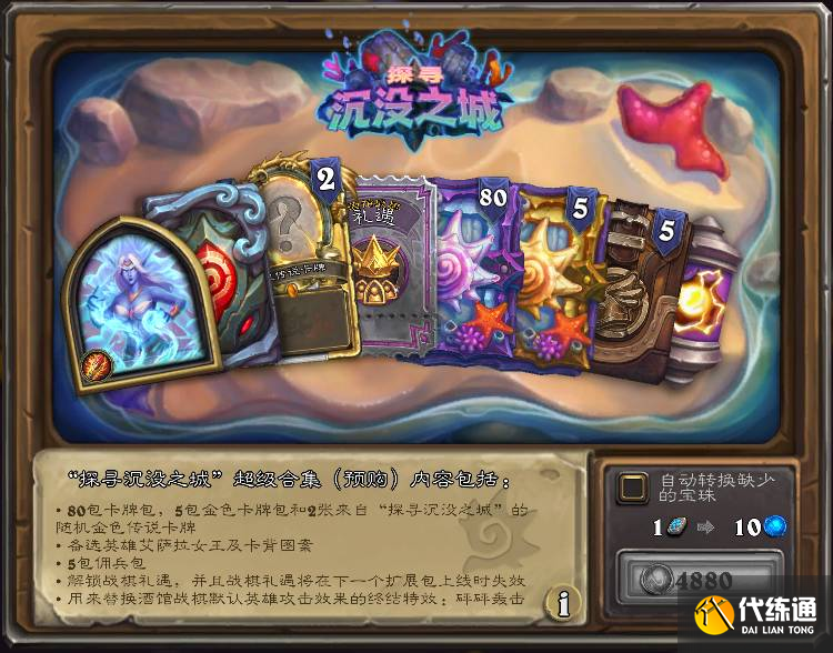 含80沉没包,5金色沉没包,2张随机沉没金橙,法师新英雄皮肤“艾萨拉女王”,预购卡背“艾萨拉”,战棋礼遇,战棋终结特效“砰砰轰击”,和5佣兵包。国服售价488,北京时间4月12日下架。