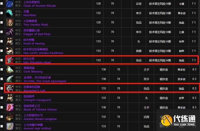 祖阿曼的两款DPS饰品分别是妖术之颅和狂暴者的召唤,虽然这两款饰品的物品等级只有133级,但是由于这两款饰品是TBC版本P4阶段最强的主动饰品,并且玩家们也已经彻底厌倦了牌子饰品,所以这两款饰品也成为了很多玩家眼中必拿的饰品。