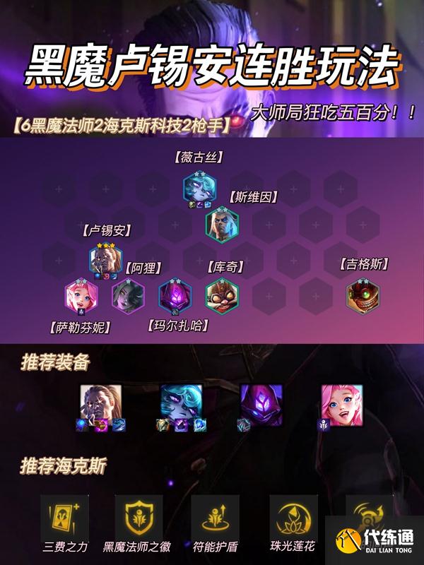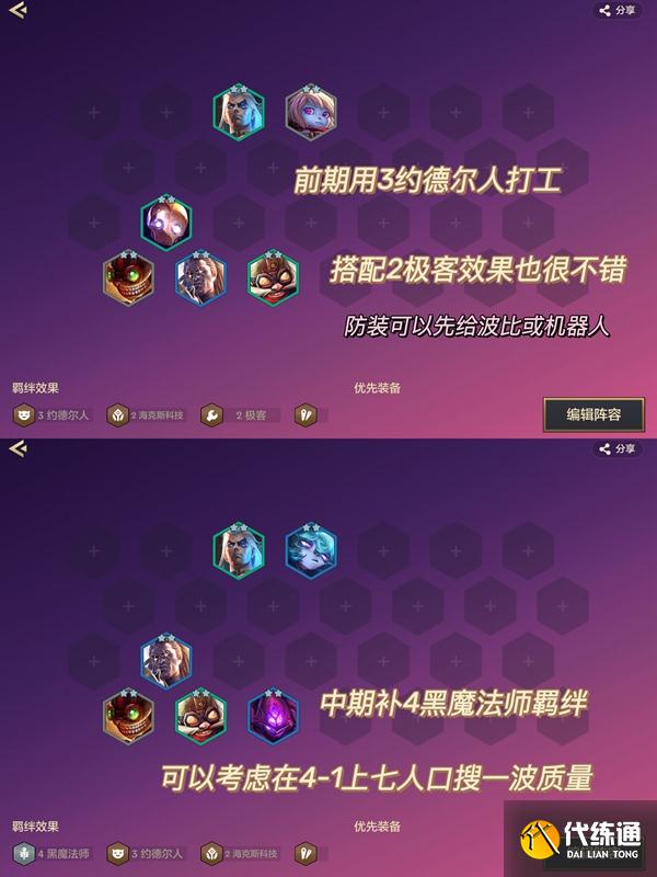 中期补齐4黑魔法师羁绊!防装都给薇古丝4-1上七人口搜牌提升质量~优先让卢锡安2星血量稳定后拉八人口凑6黑魔法师羁绊!满满追3星卢锡安,后期能够考虑将库奇或萨勒芬妮替换成金克丝补2极客羁绊!如果有黑魔转职能够追九人口冲8黑魔法师羁绊