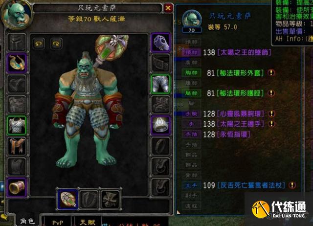 话不多说直接来看此萨满的装备,这是一个兽人小萨满,看名字和装备显然是元素萨。他留着跟大地之环长者一样的发型胡须,但全身上下仅有8件装备,其中1件还是灰色披风没有任何属性,2件绿装估计还是围栏掉的,4件紫装是T5本买的,显然是为了做海山门任务——好消息,以后这种萨满不需要做任务也可以打T6本。武器也是一把练级路上的蓝武器,附魔更是没有。