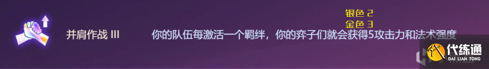 这套阵容在8人口的时间是10羁绊阵容。十分契合并肩作战海克斯,拿金色并肩作战 举例,10羁绊下全体棋子增加30攻击力与30法强 ,能够看作全员多穿了1件半的成品输出装备,阵容输出强度大大增强 ,两大主C螳螂与刀妹输出强度更是直接拉满 ,哪怕无装备也能造成极高的输出。