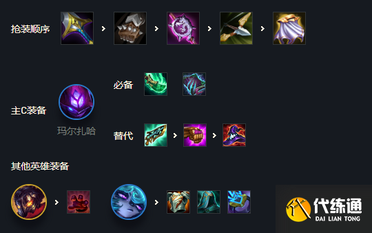 玛尔扎哈作为阵容核心C位,因其技能持续性伤害青龙刀使其技能释放频率大幅增加,再选择上鬼书减疗相得益彰,最后一件大天使,法爆,大帽,巨杀,等输出装或科技枪都是能够的,最关键的是没有三星玛尔扎哈能够换维克托C。