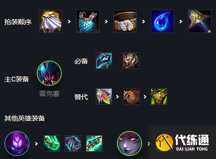 雷克塞作为阵容核心旗子,搭配龙爪,救赎让其生存能力大幅度增加,再搭配泰坦增加整体坦度与输出化身不死小强