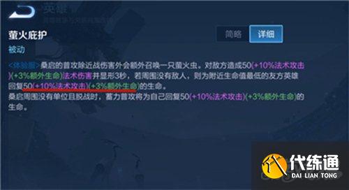 2.其一是【生命值】,其二是【法术强度】,其实在桑启的被动技能描述这里已经说的很清楚了,萤火虫会给附近生命值最低的英雄恢复10%法术攻击+3%额外生命的恢复量。