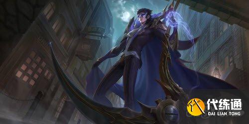 神秘的白色眼罩与深紫色的燕尾服装扮,体现出他贵族的身份,武器以挂表齿轮为原型,结合哥特风格纹样打造出的巨镰,在具备强大杀伤力的同时也不失贵族的特质,同样风格的肩甲和护臂也能起到保护的作用。