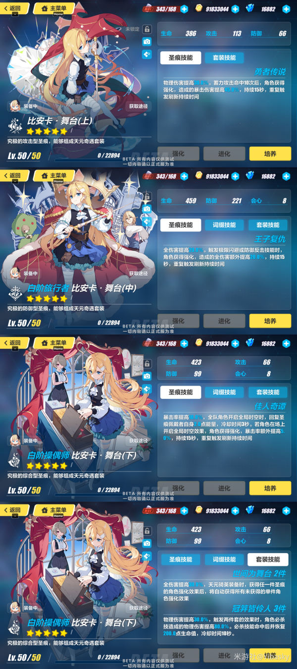 崩坏3天元骑英圣痕搭配: 专属圣痕:比安卡·舞台 「比安卡·舞台」全套圣痕激活后,共计获得加成:物理伤害提高60%、暴击伤害提高45%、全伤害提高70%、暴击率提高15%、必杀技物理伤害提高80% 该套圣痕对「天元骑英」的专属度较高,上位圣痕需要蓄力攻击命中10次触发,对其他角色触发难度较高,反 阅读全文...