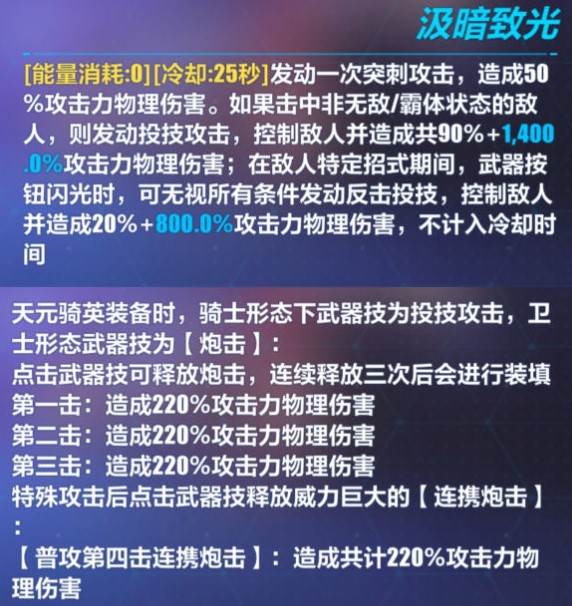 崩坏3天元骑英武器搭配: 专属武器(未超限):子夜的黑光 专属武器(超限):子夜的阿塔吉娜 专武武器特殊机制 (以超限专武:子夜的阿塔吉娜为例,特殊机制技能超限与未超限仅倍率区别) 「天元骑英」装备时,骑士形态下武器技能为投技攻击,卫士形态下的武器技能为「炮击」。 在卫士形态下,点按武器技能释放 阅读全文...