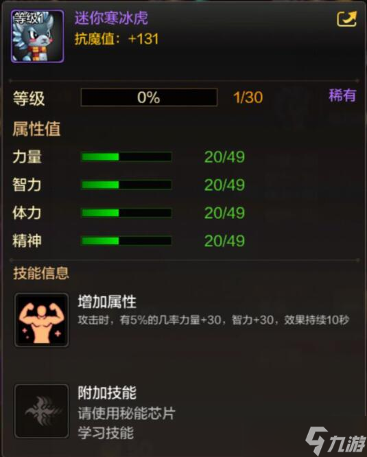 《DNF》手游迷你寒冰虎是游戏中的一个稀有宠物,这个宠物在稀有宠物中并不突出。那么迷你寒冰虎在游戏中的具体属性是什么呢?下面小编给大家分享的就是DNF手游迷你寒冰虎怎么样相关内容,感兴趣的小伙伴一起来看看吧。迷你寒冰虎属性抗魔值:+131等级:稀有属性满级力量49满级智力49满级体力49满级精神49 阅读全文...