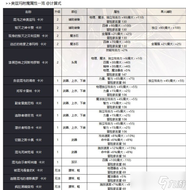 DNF奥兹玛团本有哪些附魔卡片?在DNF的游戏中,很多玩家不了解奥兹玛团本中的附魔卡片的属性,小编将所有类型的卡片进行了整合,里面包含了所有卡片的属性说明,一起来看看吧。DNF奥兹玛团本附魔卡片属性大全混沌之神奥兹玛卡片:辅助装备,物理、魔法独立攻击力+90(最大:+110),冒险家名望130毁灭之 阅读全文...