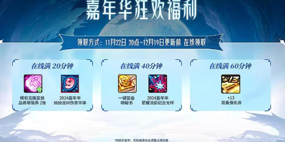 嘉年华13券需要达到条件才能领取,很多玩家想知道嘉年华13券领取时间有什么限制,在2024年12月19日维护前登录游戏参与活动嘉年华狂欢季,累积登录60分钟后才能领取,以下就是DNF嘉年华13券领取时间限制介绍。【DNF2024嘉年华攻略】dnf嘉年华13券领取时间有什么限制答:2024年12月19 阅读全文...