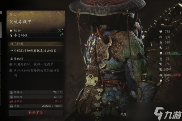 ?黑神话悟空中的昆蚑毒敌甲是一个衣甲,品质为仙品。? 昆蚑毒敌甲具有以下特点和效果: ?防御值?:提供72点防御。 ?毒伤耐性?:增加7点毒伤耐性。 ?独门妙用?:一定程度增加所有赋毒攻击伤害。 ?穿戴效果?:集齐两件时,在使用丹药时获得一定棍势;集齐四件时,少许增加所有丹药效果的维持时间。 要 阅读全文...