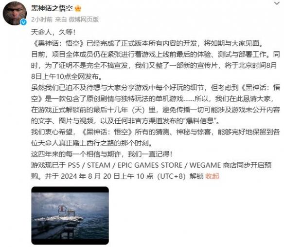 黑神话悟空发售日期详情?经过了四年漫长的等待,近日黑神话终于发布了准确的发售信息,很多玩家已经开始预购,部分玩家还不知道详细的发售情况,下面小编就为大家带来详细的发售日期,希望能帮到大家。 黑神话悟空攻略大全 黑神话悟空发售日期介绍 答:2024年8月20日上午十点。 1.就在8月8日早上,游戏科 阅读全文...