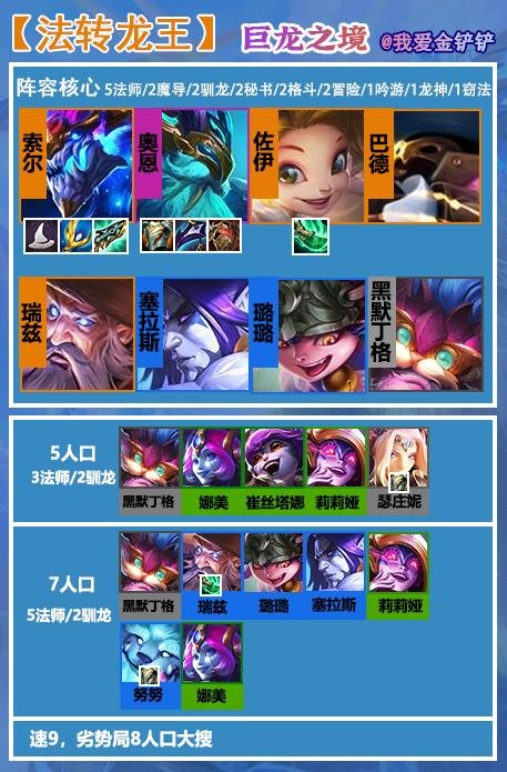 在金铲铲之战的游戏中,巨龙之巢版本即将来临,很多小伙伴还没有接触到不知道该玩什么阵容,下面小编就为大家推荐一个法转龙王阵容,希望大家成功吃鸡。 一、阵容组成 【阵容组成】 索尔、奥恩、佐伊、巴德、瑞兹、塞拉斯、璐璐、黑默丁格 【阵容羁绊】 5法师/2魔导/2驯龙/2秘书/2格斗/2冒险/1吟游/1 阅读全文...