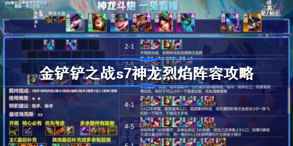 游戏在近期更新了新赛季巨龙之巢,那么在这个赛季中的神龙烈焰该怎么玩呢,下面就一起来看看具体的攻略分享吧,感兴趣的小伙伴千万不要错过哦。 金铲铲之战s7神龙烈焰阵容怎么搭配 1、秘术烈焰炮 阵容推荐:娜美、金克丝、璐璐、库奇、娑娜、石傲玉、巴德 该阵容的核心是克制法系阵容,加上璐璐的技能能够给克制 阅读全文...