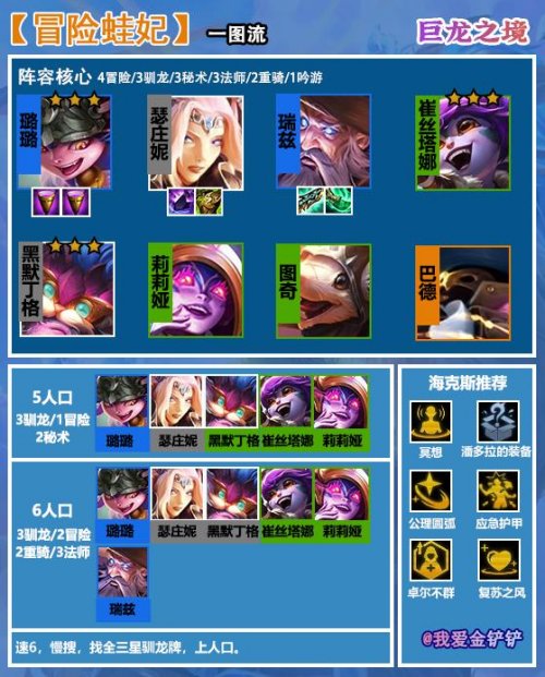 在金铲铲之战手游中,玩家可以使用各种棋子组成有趣的阵容,现在小编就为大家带来了金铲铲之战冒险驯龙大师怎么玩的阵容攻略,这是一个养蛙的阵容,如果你感兴趣的话,可以一起来看看哦! 阵容分析 1.组成 老鼠,猪妹,流浪,大头,小炮,璐璐,莉莉娅。 2.装备 小炮:必备杀人剑和分裂弓,最后一件可无尽,轻 阅读全文...