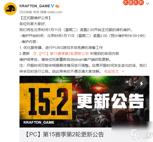 绝地求生1月12日更新公告 各位玩家大家好,我们将在北京时间1月11日(星期二)凌晨2:00开始正式服的停机维护。 - 维护开始时间:北京时间1月11日(星期二)凌晨2:00(预计维护时长39小时) 1. 优化服务器,进行PUBG游戏本体免费的准备工作 2.更新第15赛季第2轮更新公告中提到的各项 阅读全文...