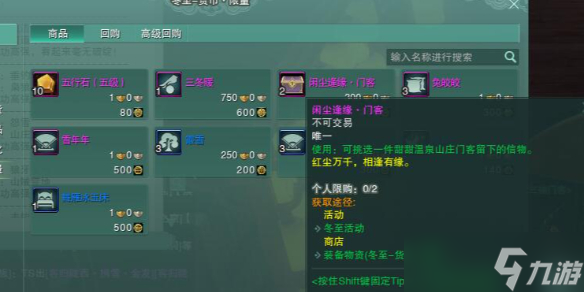 使用信物可以提高遇见门客的几率,很多玩家想知道温泉山庄门客信物怎么获得,打开冬至活动的商店找到【物资】-【冬至·货币·限量】,购买【闲尘逢缘·门客】,每年可以购买2个,以下就是剑网3温泉山庄门客信物获得方法2024。【剑网3温泉山庄2024攻略】剑网三温泉山庄门客信物答:冬至活动商店中购买详细介绍1 阅读全文...