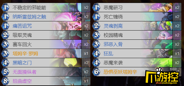 一、卡组构成 1费:不稳定的邪能箭x2;恶魔研习x2;纳斯雷兹姆之触x2;死亡缠绕x2;痛苦诅咒x2 2费:灵魂剥离x2;吸取灵魂x2 3费:校园精魂x2;赛车回火x2;邪恶入骨x2;*塔姆辛·罗姆 4费:狂乱x1;黑暗之门x2;恶魔来袭x2 5费:无面操纵者x2 6费:*恐惧巫妖塔姆辛 8费: 阅读全文...