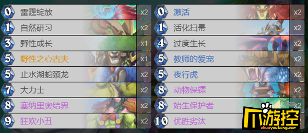 一、卡组构成 0费:雷霆绽放x2;激活x2 1费:自然研习x2;活化扫帚x2 3费:野性成长x1 4费:过度生长x2 5费:*野性之心古夫;教师的爱宠x2;止水湖蛇颈龙x2;夜行虎x2 7费:大力士x2 8费:动物保镖x2;塞纳里奥结界x2;始生保护者x2 9费:狂欢小丑x2 10费:优胜劣汰x 阅读全文...