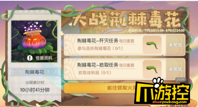 时间:7.30日-8.5日,每天18:00-22:00期间可以挑战boss 具体玩法:根据任务指引,先获得火灵珠,之后可以在固定时间内攻击boss,获得藤曼道具 每天最多获取30个,活动期间共可以获得150个 阅读全文...