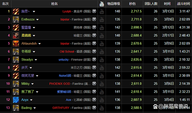 随着距离魔兽世界TBC怀旧服P3阶段开放时间越来越长,玩家们装备越来越好的同时,WCL上的DPS数据也越来越高。之前排名第一的是国服第一位集齐蛋刀的盗贼,随后变成了外服猎人,而在这个CD一名国服术士又超过了外服猎人成功登顶WCL。 上面是T6团本BOSS战的最新数据,可以看到排名 阅读全文...