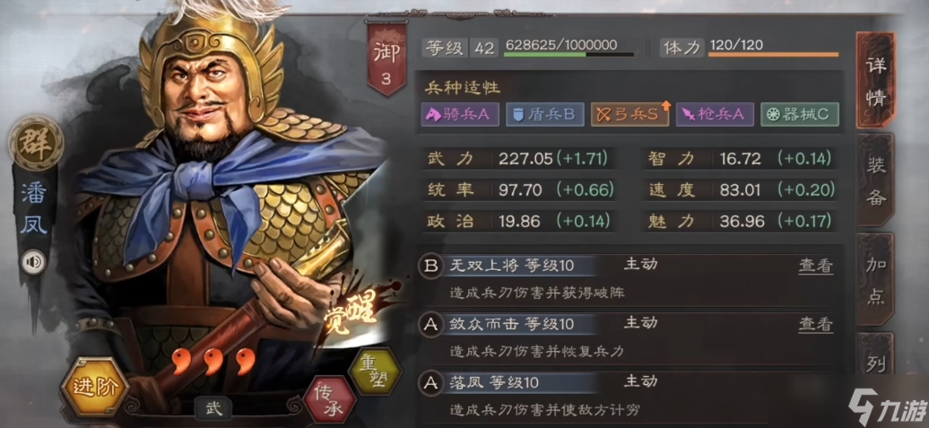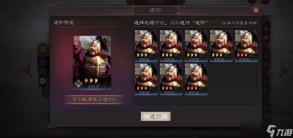 五星武将一般都是要进阶到满红的,也就是进阶五次把五个黄色星星都变红。得到的50个属性点一般都是加在某一项属性上,这样可以大幅提升这个属性。比如擅长兵刃攻击的武将就要把50个属性点都加在武力上,这样他的武力值就会增加50,造成的兵刃伤害会更高。同样地擅长谋略伤害的武将需要把属性点全部加在智力属性上,这样谋略伤害会更高。擅长防御的武将需要给统率属性加点,这样可以提升他的防御能力。 速度和政治两个属性不是很重要一般不加,部分擅长内政的武将需要给魅力加点,这样让他去进行寻访、驯马等事项时可以得到更多的收益。每次进阶要消耗一张同名的武将卡,比如给诸葛亮进阶就要消耗一张五星的诸葛亮卡牌,因此抽到重复武将时一般都要留着进阶。"> 玩家在打开武将的信息界面后会看到左下角有一个进阶按钮,在这里可以让武将进行进阶。在获得武将后他的星数是黄色,每次进阶可以让一颗星变红,同时获得十个属性点。进阶获得的属性点可以在加点界面使用,玩家可以把得到的属性点分配到武将的六个基础属性上。武将的星级越高可进阶的次数越多,五星武将可以进阶五次,因此 阅读全文...