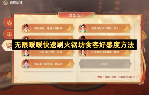 无限暖暖火锅坊好感速刷攻略 代练通轻松托管躺赢奖励 《无限暖暖》2.2 版本火锅坊玩法中,刷食客好感度是解锁留言、获取专属货币 “万相通宝” 的关键,掌握速刷技巧能高效推进,嫌手动操作麻烦?上代练通,专业托管轻松拿满所有奖励! 火锅坊食客好感速刷技巧 核心思路:跳过食客用餐时间,强制重复点单刷好感 阅读全文...