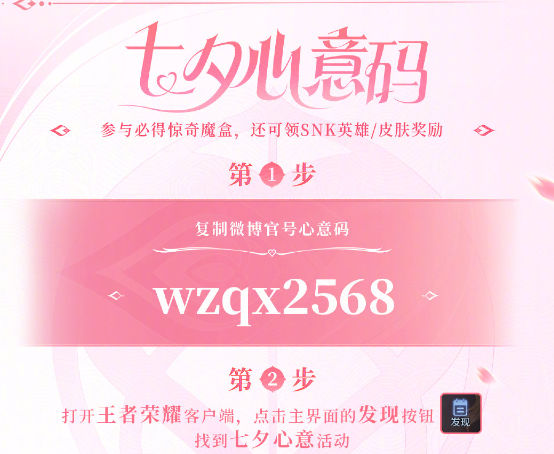 王者荣耀的七夕节福利兑换码大家都知道了吗,七夕节马上就要到啦,游戏中也有七夕心意码可以兑换,下面为大家带来的具体内容,感兴趣的玩家们千万不要错过哦! 王者荣耀七夕心意码是什么? 叮~一串神秘礼包码从天而降,恭喜你被本狐的七夕福利砸中了! 请记住这串神秘代码【wzqx2568】! 请记住这串神秘代 阅读全文...