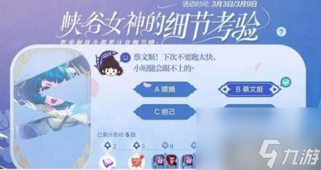 不少玩家都不太了解,想知道关于王者荣耀攻略推荐,接下来就让九游小编给大家带来这个攻略。 猜猜这是哪位峡谷女神呢?提示:千万不要踩到她的裙子! 答案:武则天 前面有没答对的也不要急,只有后面关注小编一起选正确答案,女神节奖活动励还是稳稳的,除了头像框外还有机会得到永久英雄露娜、钻石等。 相关内容扩 阅读全文...