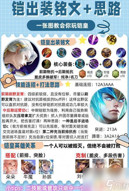 想在王者峡谷化身一刀流战神?凯皇攻略直接抄作业! 核心技能解析被动【修罗之魂】是凯的单挑资本,对单个目标增伤 50%,对线或切 C 时尽量避开小兵,伤害直接拉满。一技能回血拉扯、二技能击飞接强化普攻近身,大招开启后获得高额双抗和攻击力。8 秒内变身团战收割机。 暴力连招公式蹲草秒 C:2A3A1A 阅读全文...