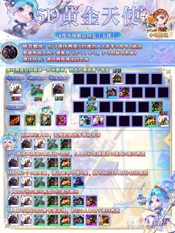 在云顶之弈游戏中,S9赛季里5D黄金天使阵容玩家应该怎么搭配呢?看来还是有很多小伙伴们都还不是很清楚吧,那么接下来就与小编一起来看看《云顶之弈》S95D黄金天使阵容推荐介绍吧。 《云顶之弈》S95D黄金天使阵容推荐 1.云顶之弈5D黄金天使阵容组成:凯尔、波比、提莫、克烈、加里奥、娑娜、盖伦、拉克 阅读全文...