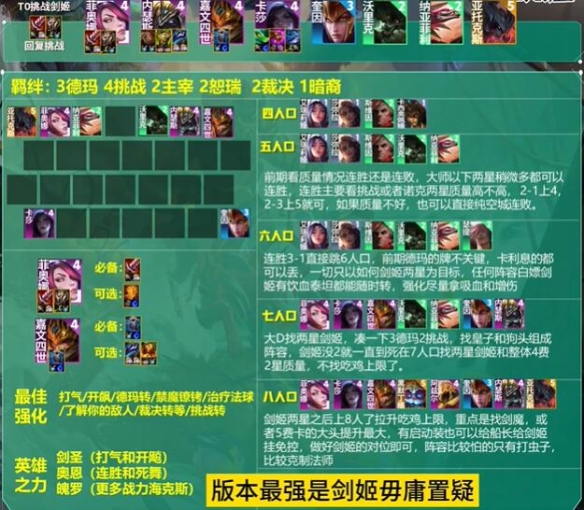 云顶之弈s9.5赛季有哪些阵容可以用来上分?当前赛季版本中会有很多强势英雄,这些英雄想要搭配成阵容可以参考下面的攻略,游戏鸟小编会把s9.5赛季的英雄搭配组队技巧分享在下方,有兴趣的玩家可以来多了解一下。 云顶之弈s9.5最强阵容大全 1、挑战剑姬 阵容构成:剑姬、狗头、皇子、卡沙、鸟人、狼人、狗 阅读全文...