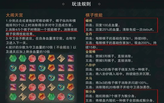 《一梦江湖》x《大闹天宫》展开重磅联动。此次联动随游戏周年版本「千灯宴」同步上线,为玩家带来一系列全新剧情、趣味玩法及联动限定外观。那么联动期间大闹天宫消消乐小游戏中棋子的技能是什么呢?小编为你准备了一份攻略,一起来看看吧~ 比较重要的技能为四消蟠桃回100血,五消蟠桃250血,五消酒壶吸血,没 阅读全文...