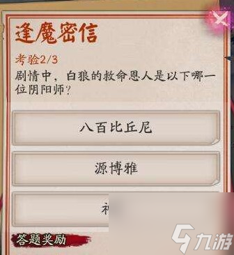 今天我要和大家分享一篇关于阴阳师白狼哪里打?,希望大家喜欢 在阴阳师手游中,逢魔之时玩法逢魔密信问题:剧情中,白狼的救命恩人的以下哪一位阴阳师? 选项有:八百比丘尼、源博雅、神乐。 答案:源博雅 解析:在白狼的传记中,在白狼的初次化形时,有一位阴阳师救了她,阴阳师射箭将怪物打到,而主角中源博雅符合 阅读全文...
