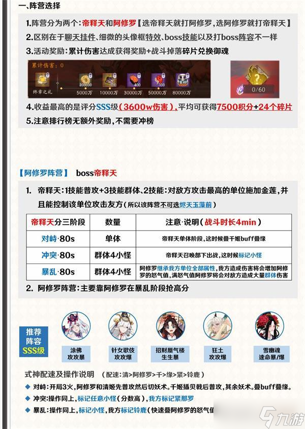 在阴阳师手游当中很多玩家还不清楚这个游戏玩法和技巧是什么。关于这个小编已经帮大家准备好了相关内容,希望可以帮助到大家,快来和小编一起来看看吧!阵营选择、收益最大化、阵容推荐(无SP灯姐)、首领技能、奖励一览以上是阴阳师善恶终章打法攻略,希望对大家有帮助!相关内容扩展阅读:阴阳师平安印花获取攻略炭治郎 阅读全文...