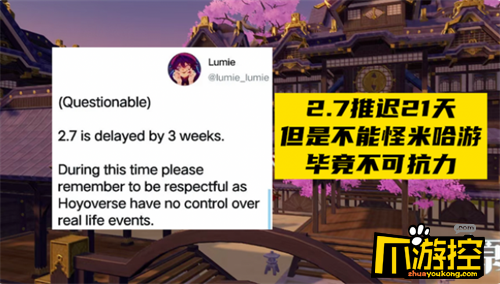 亲爱的旅行者: 2.7版本更新停服维护预计将会在2022/05/31 6:00开始,预计5小时内完成。同时,2.7版本的持续时间预计为6周,2.8版本预计将于2022/07/13更新。 非常抱歉本次更新延期给各位带来了不便。 当前游戏中,角色活动祈愿,武器活动祈愿,以及活动「且试身手」将于202 阅读全文...