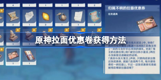 原神最近开启的活动荒泷极意堂堂斗虫大试合,玩家做任务可以获取拉面优惠卷,下面小编为大家带来原神拉面优惠卷获得方法,感兴趣的小伙伴一起了解一下吧。 原神拉面优惠卷在哪 道具:归属不明的拉面优惠券 获取方法:在「荒泷极意堂堂斗虫大试合」中,协助「真剑斗虫大鬼王」荒泷一斗对抗「花角玉将」一派的斗虫好手 阅读全文...