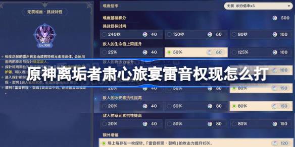 原神离垢者肃心旅宴怎么打?挑战中需要选择buff和debuff,击败怪物即可完成,获得奖励。下面为大家带来原神离垢者肃心旅宴打法攻略分享,希望对大家有所帮助。 原神离垢者肃心旅宴打法攻略 1、首先选择积分倍率x5,其它挑战难度如图选择就行。正常练度的话,时间选择150秒也是够的,分数还能更高,不过 阅读全文...