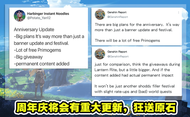 枫原万叶Up池马上就要上线了,之后还有稻妻版本即将和大家见面,未来版本确实有很多内容值得期待。不仅如此,又有内鬼透露了一些新情报,涉及周年庆、层岩巨渊等等,下面就让我们一起来看看吧。 不知不觉中,原神已经上线了近一年的时间,这也意味着周年庆很快就会来了。有一些外服内鬼透露了周年庆 阅读全文...