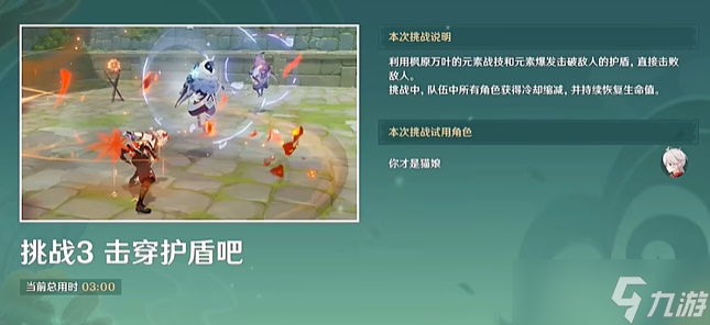 原神冒险家试炼进阶篇击穿护盾吧攻略 参与条件:冒险等阶≥20级 第一天:三个定序试炼 试炼3:击穿护盾吧 使用角色:鹿野院平藏 挑战规则 1、利用枫原万叶的元素战技和元素爆发击破敌人的护盾,直接击败敌人。 2、挑战中,队伍中所有角色获得冷却缩减,并持续恢复生命值。 步骤: 1、首先玩家是需要先进入到游戏中去,随后玩家就是可以就是可以看到要求就是要击穿敌人的护盾即可击败敌人。 2、然后玩家就是需要在其中进行击败敌人,注意是需要消灭16个敌人才行。 3、最后就是将所有的敌人全都打倒,完成过后就是会有提示玩家们挑战成功。 "> 在游戏中是有着冒险家试炼进阶篇这一活动关卡,玩家在游戏中是会有着击穿护盾吧这一玩法,是有着玩家是还不知道是该怎么去完成这一挑战,那么下面就为玩家们带来击穿护盾吧攻略。 原神冒险家试炼进阶篇击穿护盾吧怎么打" /> 原神冒险家试炼进阶篇击穿护盾吧攻略 参与条件:冒险等阶≥20级 第一天:三个定序试炼 阅读全文...