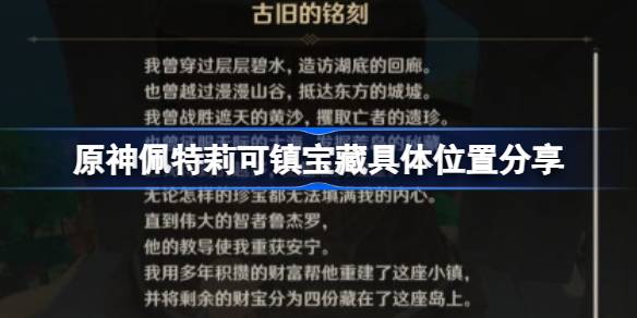 原神游戏最近新出的4.6版本剧情还有活动不知道玩家还算满意吗,这一次新版本的更新也是有很多新地区开放出来了,在新出的佩特莉可镇上可是有宝藏的,下面就让我们来看看原神佩特莉可镇宝藏具体位置分享。原神佩特莉可镇宝藏具体位置分享面朝群山之心,何寻清泉之眼,请至首角之顶,远眺吐珠之岛。奖励:成就【根本就没藏 阅读全文...