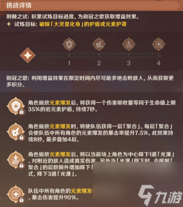 原神荆棘与勋冠第三关玩法攻略 推荐队伍:基尼奇+希露瓦+行秋+班尼特和夜阑+神里绫华+枫原万叶+香菱。 增益介绍: 1、依照破坏“大灵显化身”护盾或元素护罩的次数,分别对应为1次、2次、3次和4次。 2、将解锁以下效果:元素爆发后可生成等于生命值上限35%的岩元素护盾(持续7秒)。 3、元素爆发时 阅读全文...