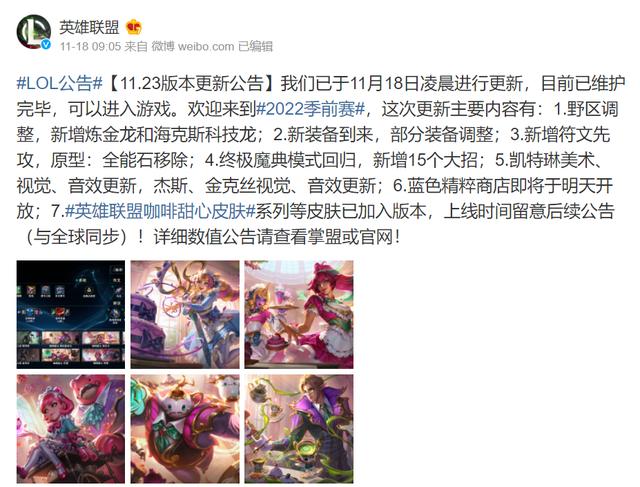 说几个这两天问得比较多的问题,11.23版本已经更新,但是该版本中咖啡甜心系列皮肤并没有在更新之后上架,这些皮肤不是雪藏,在11月18日国服的微博中说到,该系列皮肤是全球同步时间上架,而在拳头对于咖啡甜心系列皮肤的公告中说到,这个主题的皮肤将会延期至12月3日左右上架,所以在关注这个系列皮肤的 阅读全文...